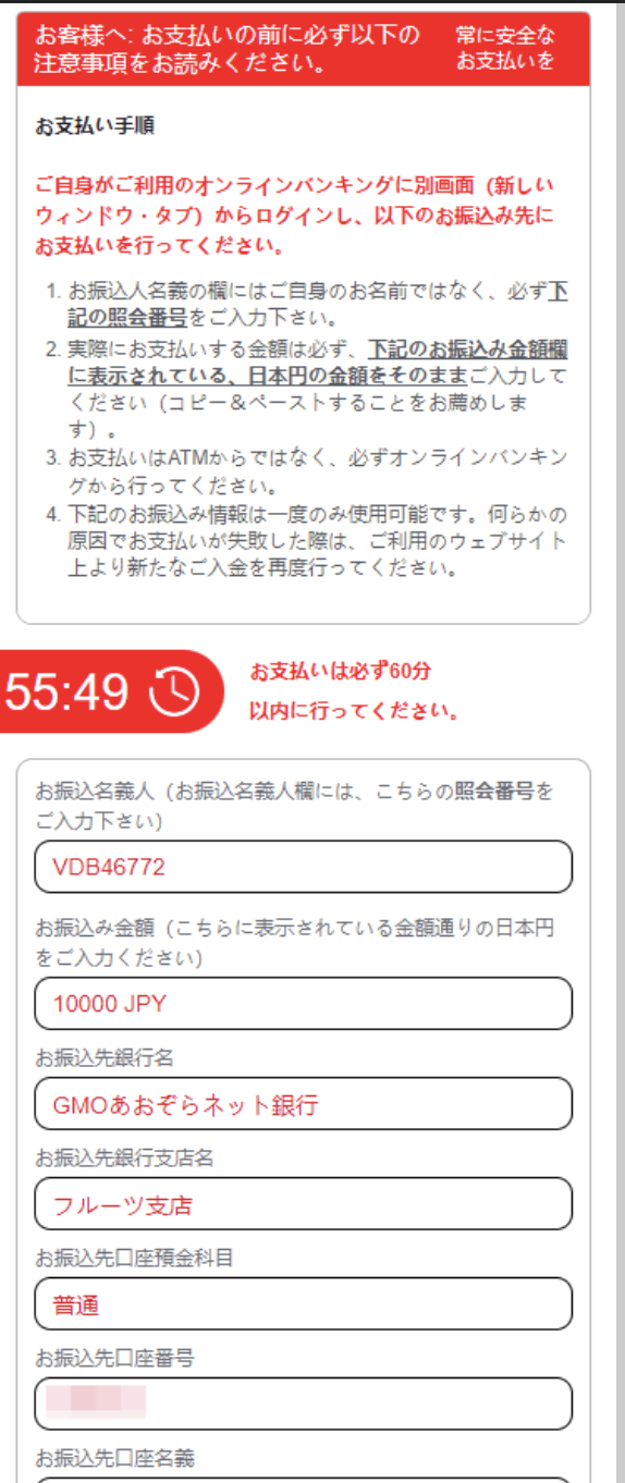 振込先口座が表示されるので、ページの案内に従って、振込先情報を記録してください。