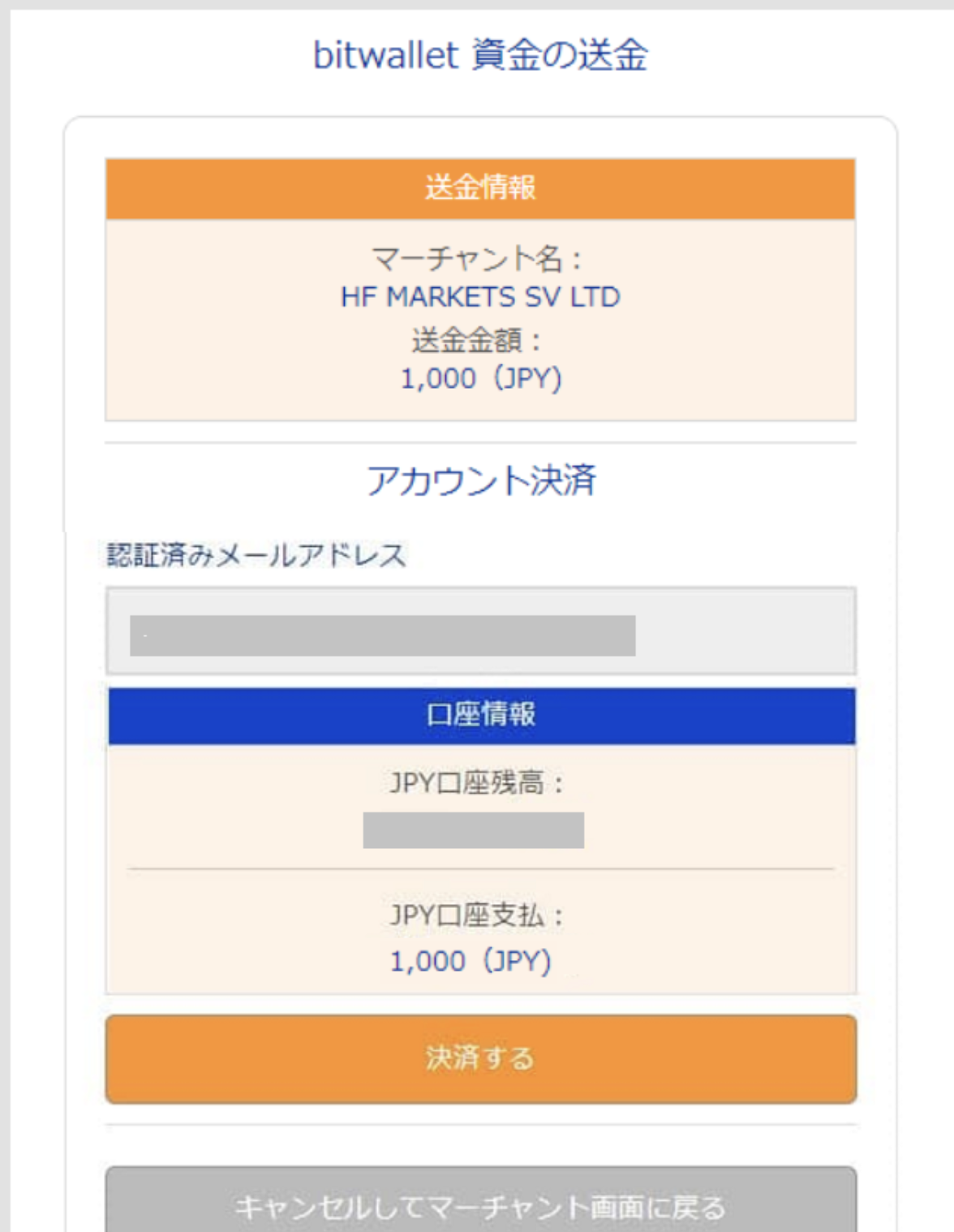 bitwalletの決済画面にリダイレクトされるので、ログインを行います。