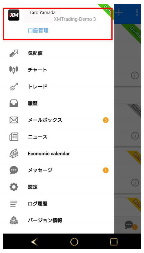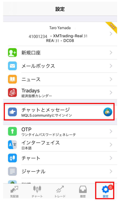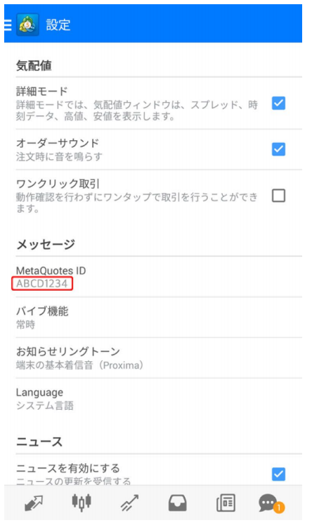 『左上三本線のメニュー』→『設定』→『メッセージ』部分のMetaQuotesID(メタクォーツID)を取得します。