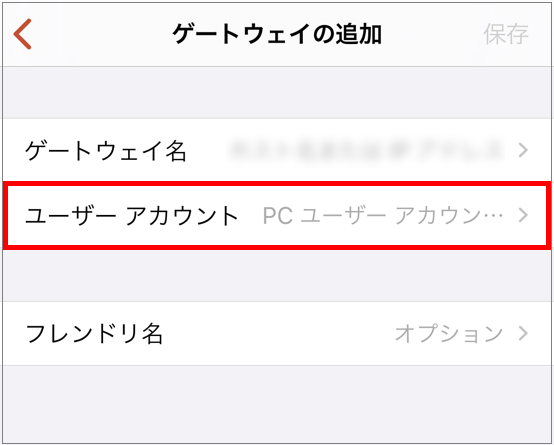画面左上の「<」をタップし「ゲートウェイの追加」画面に戻り、「ユーザーアカウント」をタップします。