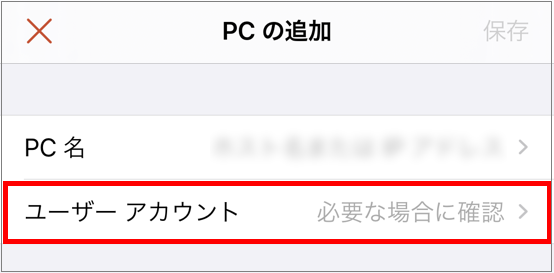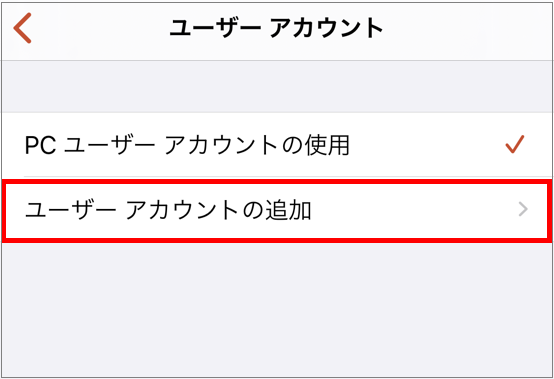 画面左上の「<」をタップし、「PCの追加」画面に戻り「ユーザー アカウント」をタップします。