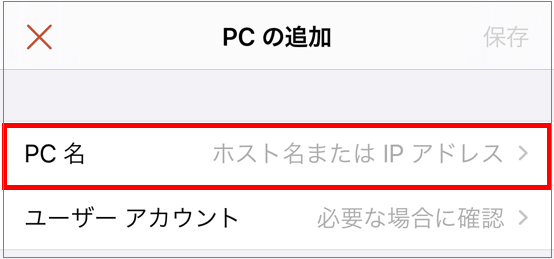 画面左上の「<」をタップし「PCの追加」画面に戻り、「PC名」をタップし以下内容を入力します。