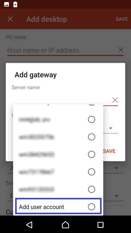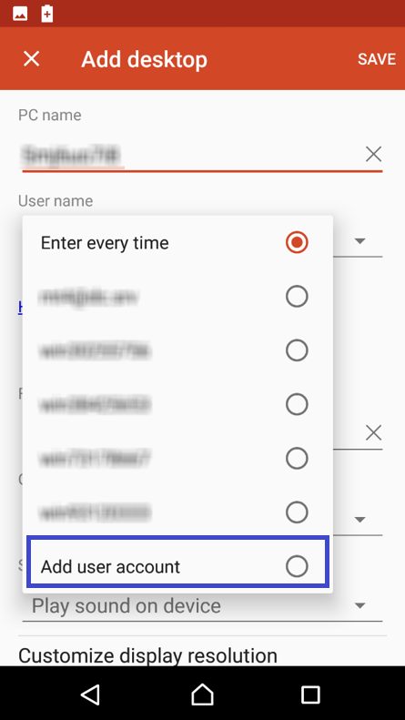 続いて「User Account」の「Use desktop user account」をタップし、表示された選択肢の中から「 Add user account」を選択します。